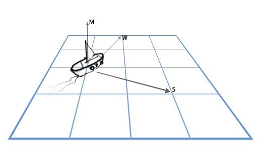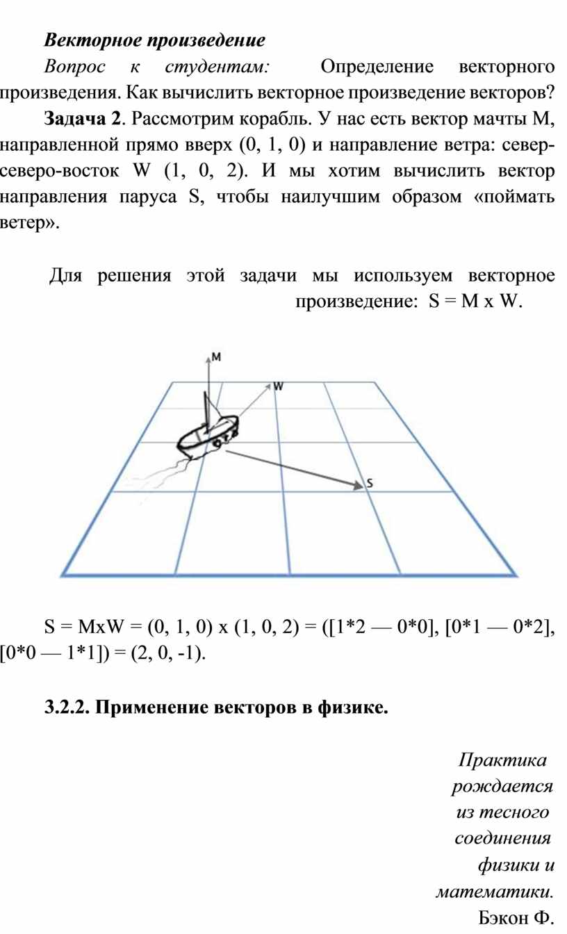 Задача 2. Рассмотрим корабль. У нас есть вектор мачты M, направленной прямо вверх (0, 1, 0) и направление ветра: север-северо-восток W (1, 0, 2). И мы хотим вычислить вектор направления паруса S, чтобы наилучшим образом «поймать ветер».