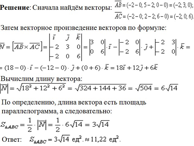 Задача 4. Даны вершины треугольника А(0;2;0), В(-2;5;0), С(-2;2;6). Найти его площадь.