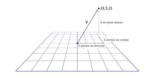 Важно отслеживать единицы измерения. Допустим, у нас есть вектор V (3,5,2). Это мало что говорит нам. Три чего, пять чего? В нашей игре Overgrowth расстояния указываются в метрах, а скорости в метрах в секунду. Первое число в этом векторе — это направление на восток, второе — направление вверх, третье — направление на север. Отрицательные числа обозначают противоположные направления, на запад, вниз и на юг. Местоположение, определяемое вектором V (3,5,2), находится в трёх метрах к востоку, в пяти метрах вверху и в двух метрах к северу, как показано на картинке ниже.