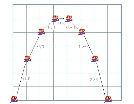Давайте рассмотрим пример с прыжками Марио. Он начинает с позиции (0, 0). В момент начала прыжка его скорость (1, 3), он быстро двигается вверх и вправо. Его ускорение равно (0, -1), так как гравитация тянет его вниз. На картинке показано, как выглядит его прыжок, разбитый на семь кадров. Показана его скорость.