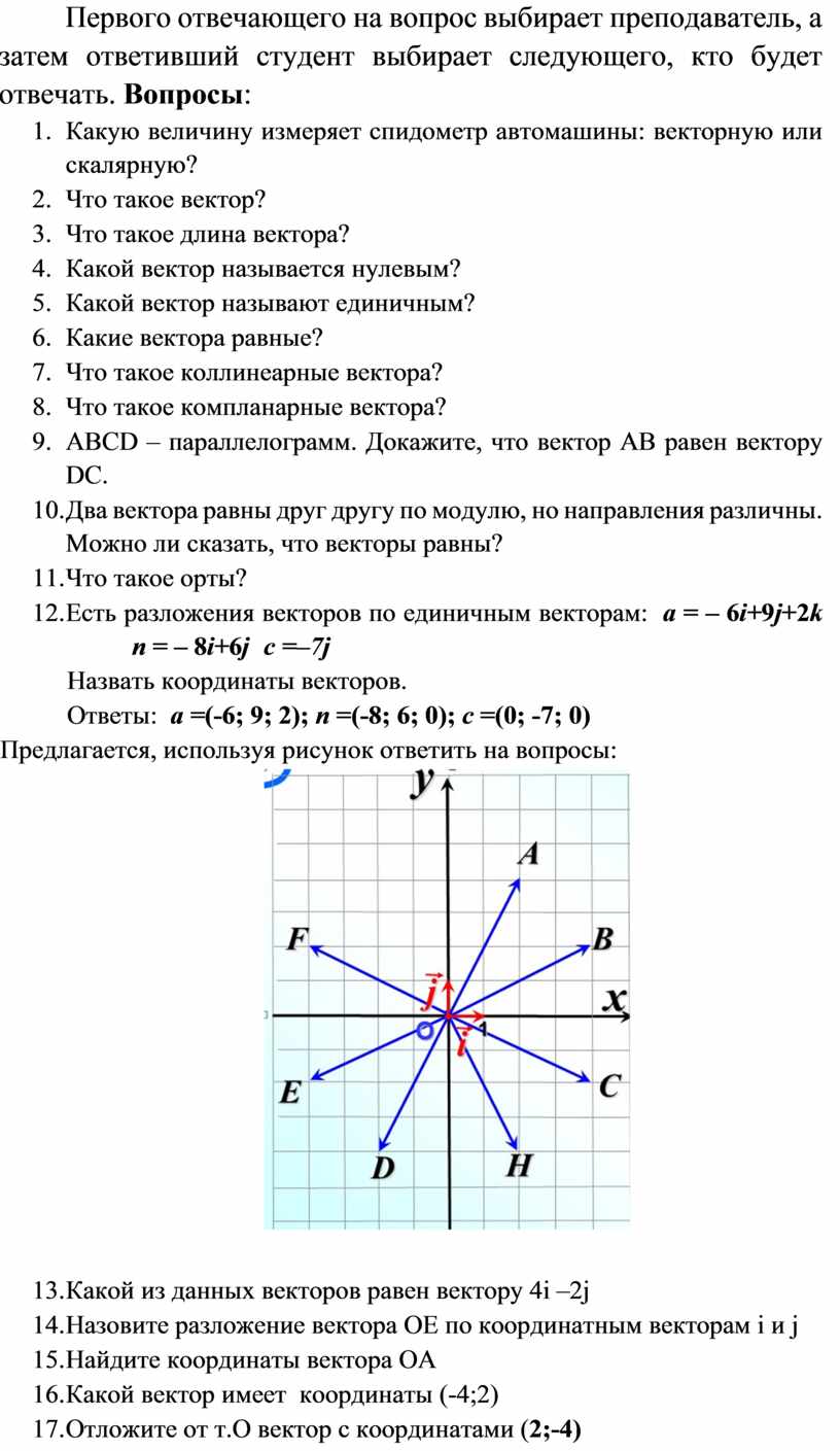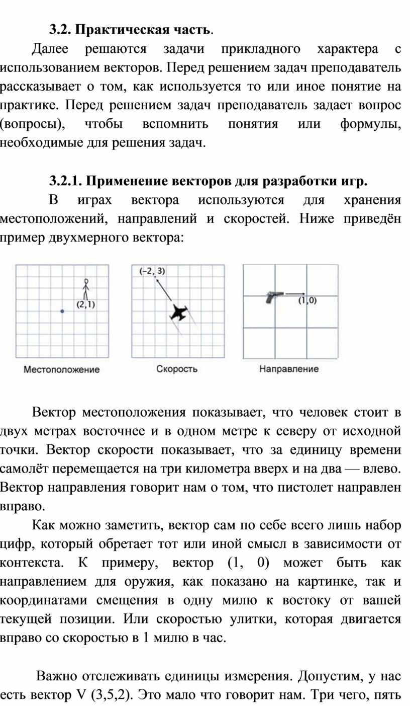 Далее решаются задачи прикладного характера с использованием векторов. Перед решением задач преподаватель рассказывает о том, как используется то или иное понятие на практике. Перед решением задач преподаватель задает вопрос (вопросы), чтобы вспомнить понятия или формулы, необходимые для решения задач.