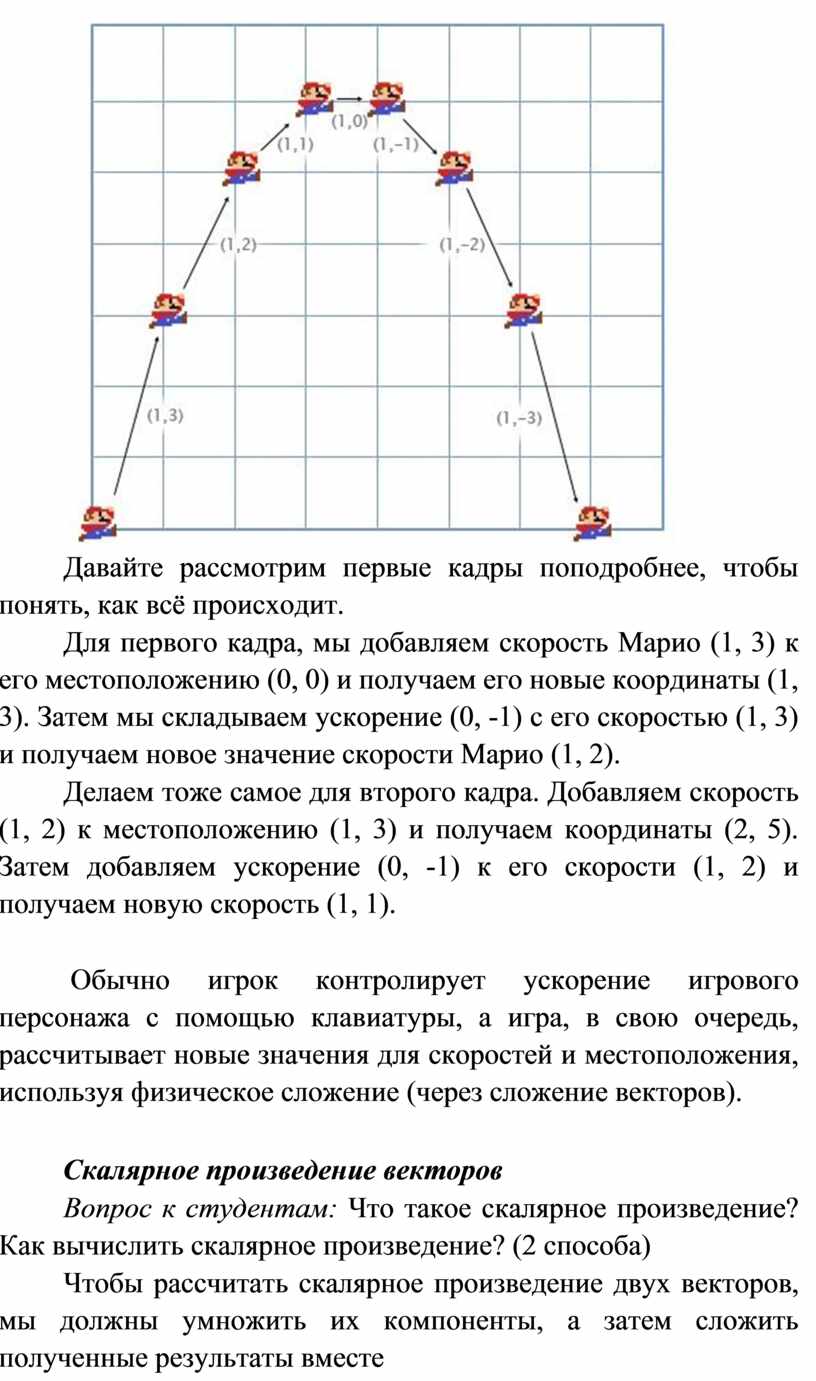 Для первого кадра, мы добавляем скорость Марио (1, 3) к его местоположению (0, 0) и получаем его новые координаты (1, 3). Затем мы складываем ускорение (0, -1) с его скоростью (1, 3) и получаем новое значение скорости Марио (1, 2).
