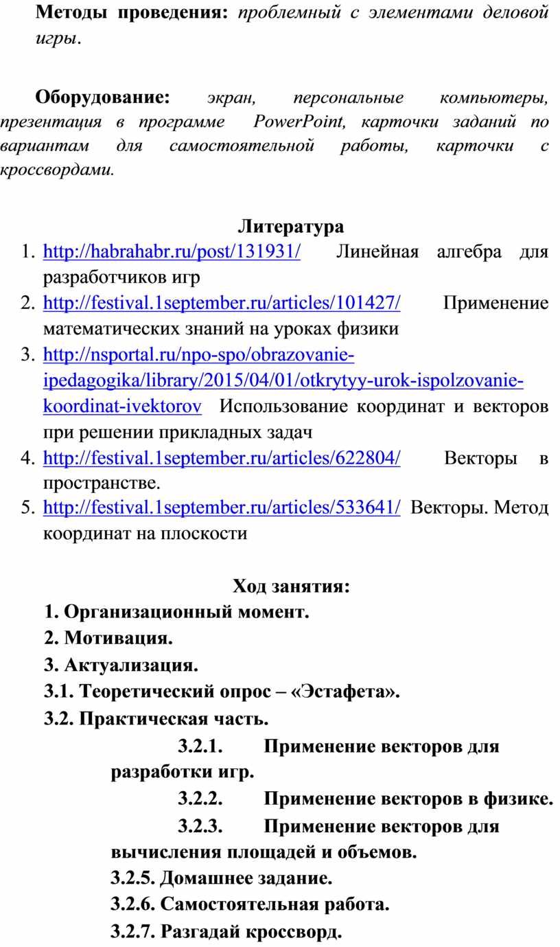 3. http://nsportal.ru/npo-spo/obrazovanie-ipedagogika/library/2015/04/01/otkrytyy-urok-ispolzovanie-koordinat-ivektorov Использование координат и векторов при решении прикладных задач