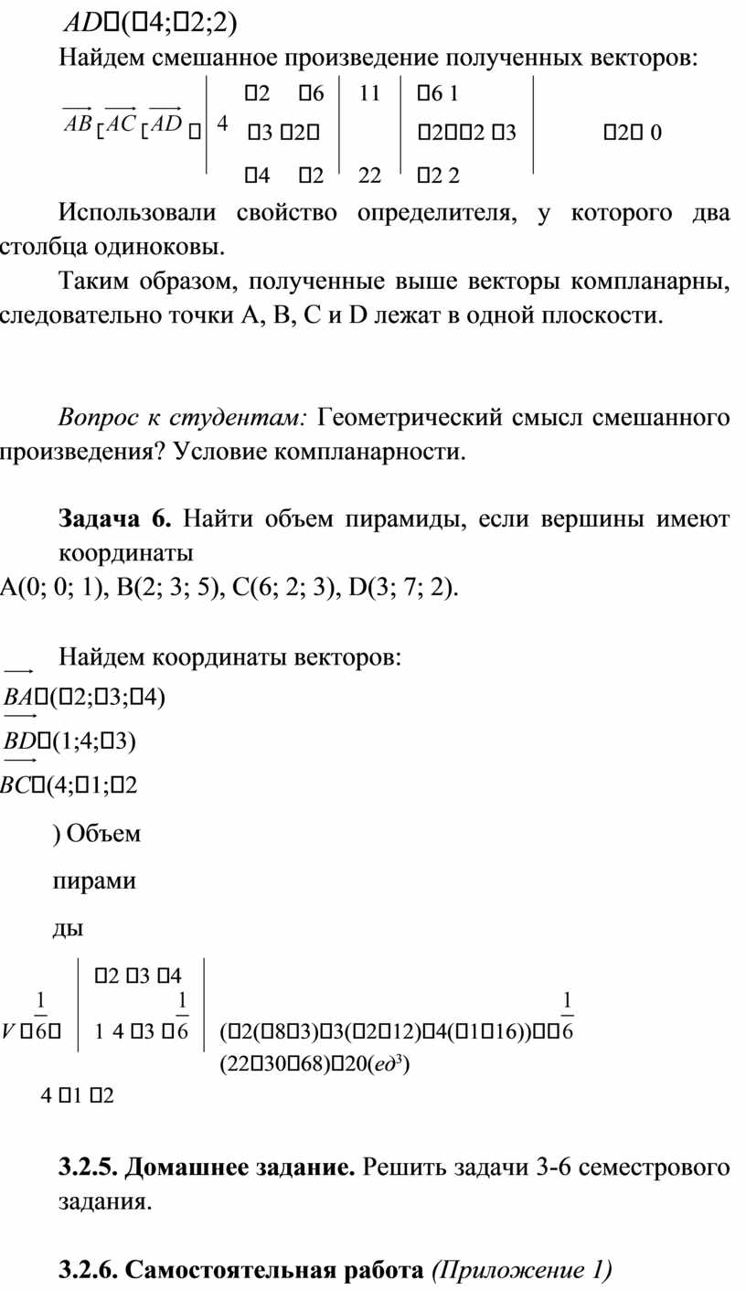 Вопрос к студентам: Геометрический смысл смешанного произведения? Условие компланарности.