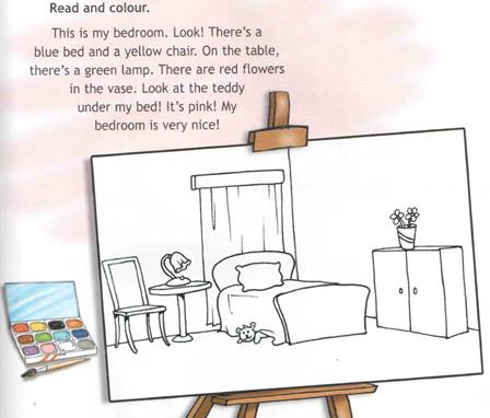 - What colour is the bed/ chair/ lamp/ flowers/ teddy bear?