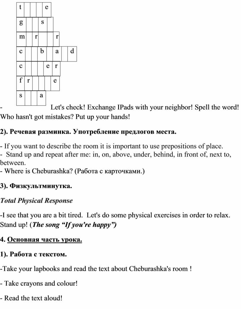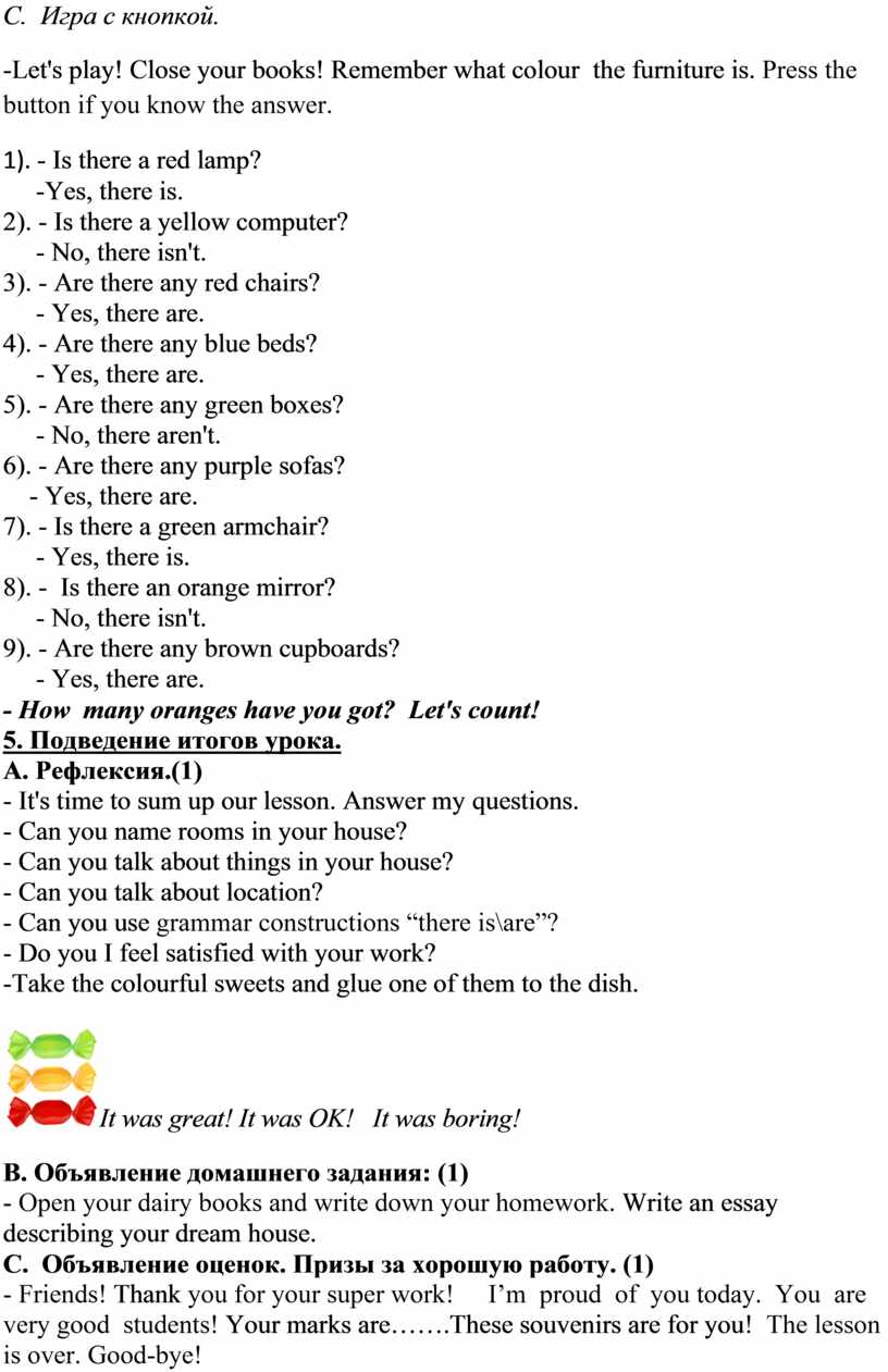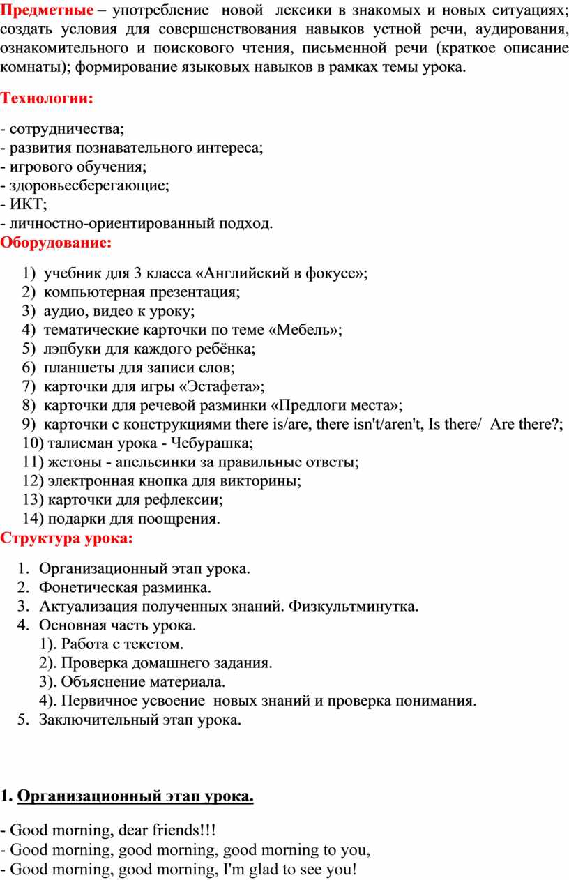 2. Образовательные. Совершенствование фонетических навыков; повторение лексических единиц по теме «Дом, квартира», «Комнаты», «Мебель»; активизация грамматического материала (предлоги места, конструкции there is/are, there isn't/aren't); обучение чтению текстов с пониманием основного содержания и с выборочным извлечением информации; развитие навыков аудирования и говорения.