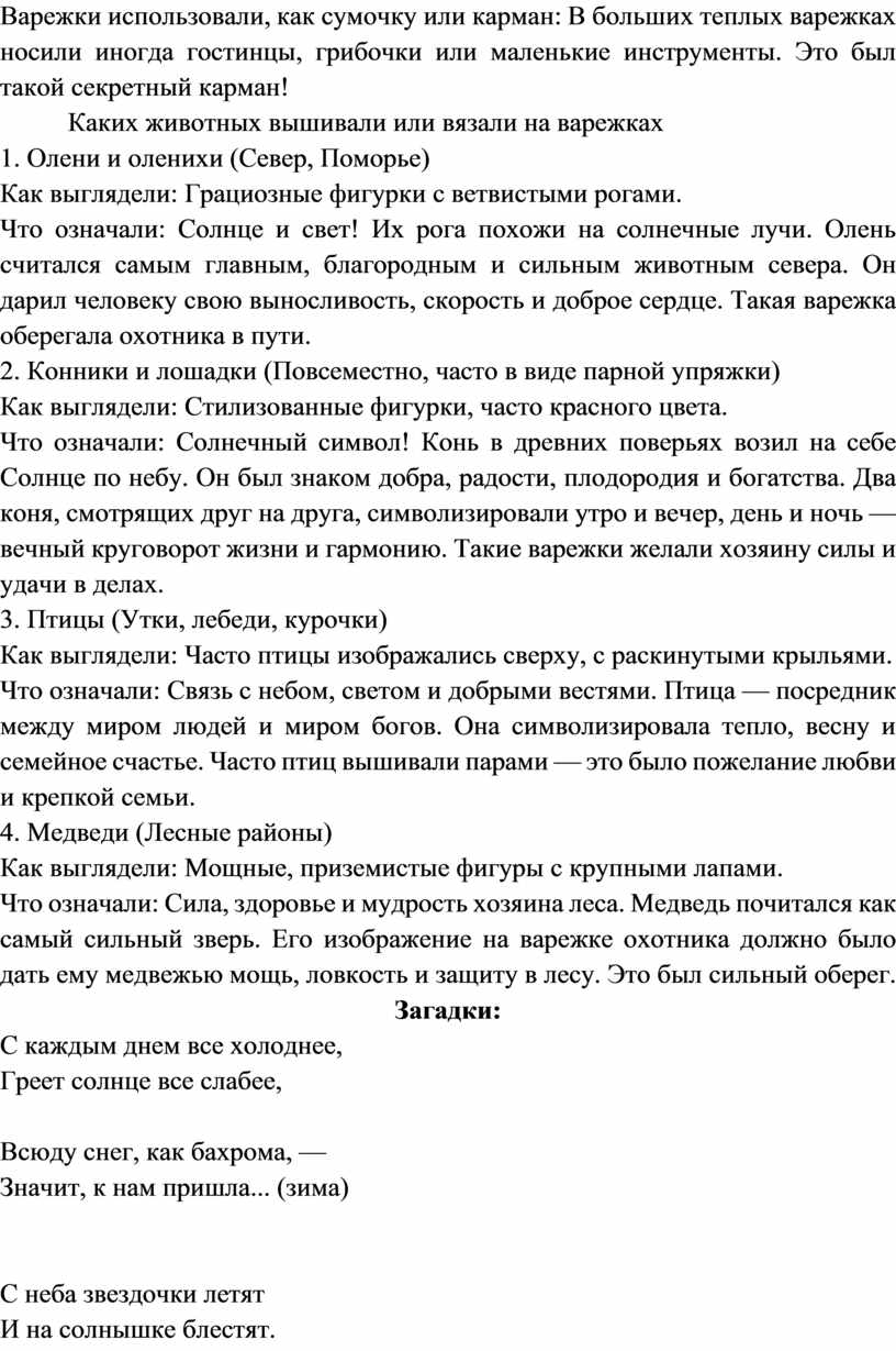 Люди верили, что узоры на варежках — это не просто красиво. Красные ромбики и кружочки символизировали солнце и огонь, чтобы согреть руки. Елочки или зигзаги — символы леса и плодородия. А изображение оленя или медведя давало хозяину варежек силу этого зверя. Считалось, что такие узоры оберегают руки хозяина от холода, болезней и всяких неприятностей.