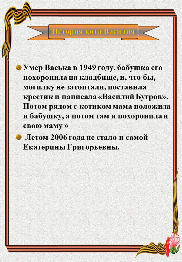 Умер Васька в 1949 году, бабушка его похоронила на кладбище, и, что бы, могилку не затоптали, поставила крестик и написала «Василий Бугров». Потом рядом с котиком мама положила и бабушку, а потом там я похоронила и свою маму »
