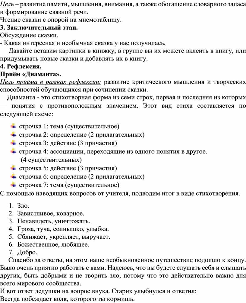 Цель приёма в рамках рефлексии: развитие критического мышления и творческих способностей обучающихся при сочинении сказки.