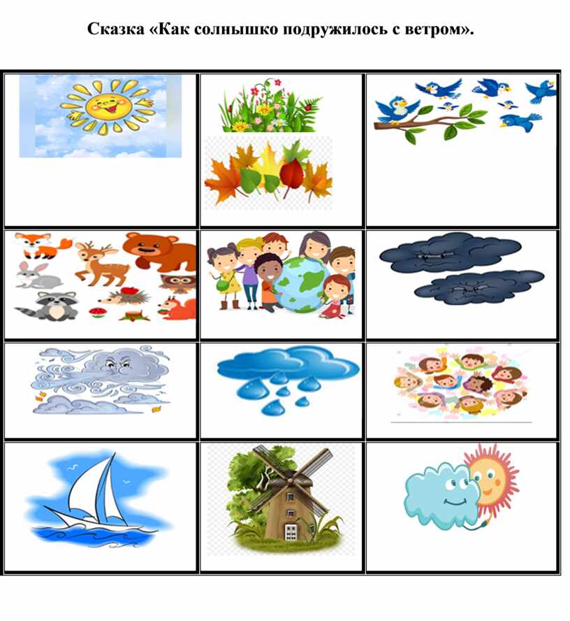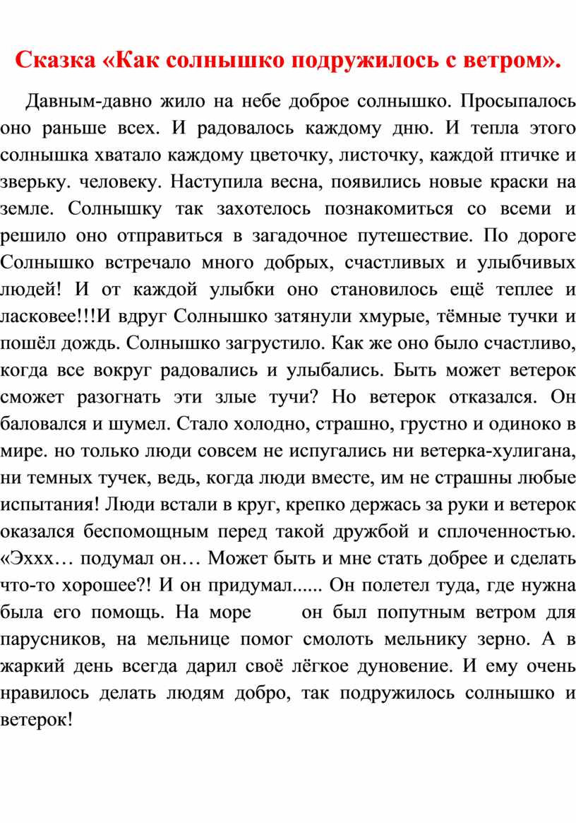 Давным-давно жило на небе доброе солнышко. Просыпалось оно раньше всех. И радовалось каждому дню. И тепла этого солнышка хватало каждому цветочку, листочку, каждой птичке и зверьку. человеку. Наступила весна, появились новые краски на земле. Солнышку так захотелось познакомиться со всеми и решило оно отправиться в загадочное путешествие. По дороге Солнышко встречало много добрых, счастливых и улыбчивых людей! И от каждой улыбки оно становилось ещё теплее и ласковее!!!И вдруг Солнышко затянули хмурые, тёмные тучки и пошёл дождь. Солнышко загрустило. Как же оно было счастливо, когда все вокруг радовались и улыбались. Быть может ветерок сможет разогнать эти злые тучи? Но ветерок отказался. Он баловался и шумел. Стало холодно, страшно, грустно и одиноко в мире. но только люди совсем не испугались ни ветерка-хулигана, ни темных тучек, ведь, когда люди вместе, им не страшны любые испытания! Люди встали в круг, крепко держась за руки и ветерок оказался беспомощным перед такой дружбой и сплоченностью. «Эххх… подумал он… Может быть и мне стать добрее и сделать что-то хорошее?! И он придумал...... Он полетел туда, где нужна была его помощь. На море он был попутным ветром для парусников, на мельнице помог смолоть мельнику зерно. А в жаркий день всегда дарил своё лёгкое дуновение. И ему очень нравилось делать людям добро, так подружилось солнышко и ветерок!
