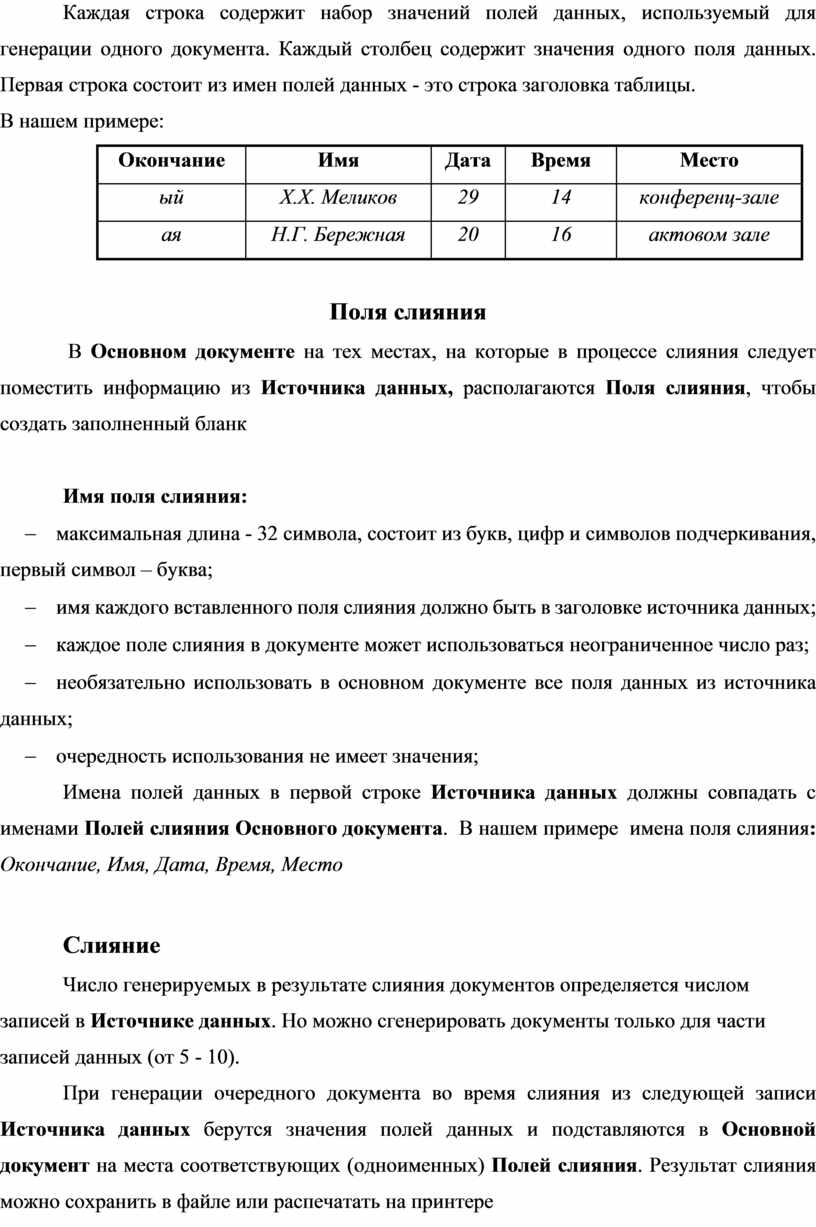 При генерации очередного документа во время слияния из следующей записи Источника данных берутся значения полей данных и подставляются в Основной документ на места соответствующих (одноименных) Полей слияния. Результат слияния можно сохранить в файле или распечатать на принтере