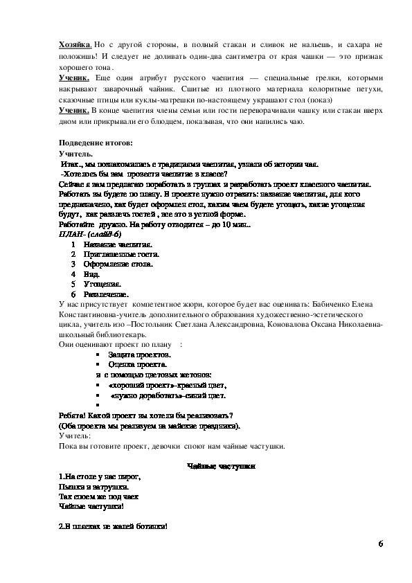 Сейчас я вам предлагаю поработать в группах и разработать проект классного чаепития.