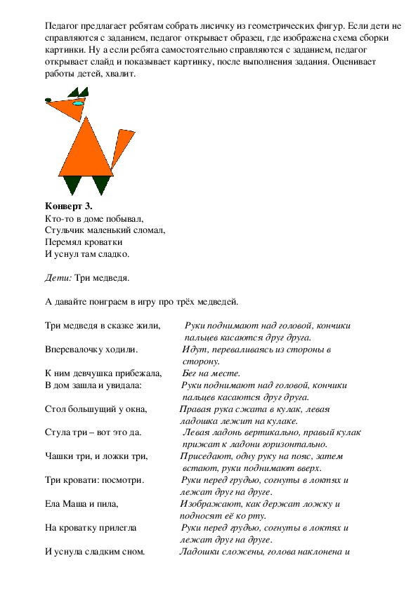 собрать.Педагог предлагает ребятам собрать лисичку из геометрических фигур. Если дети не