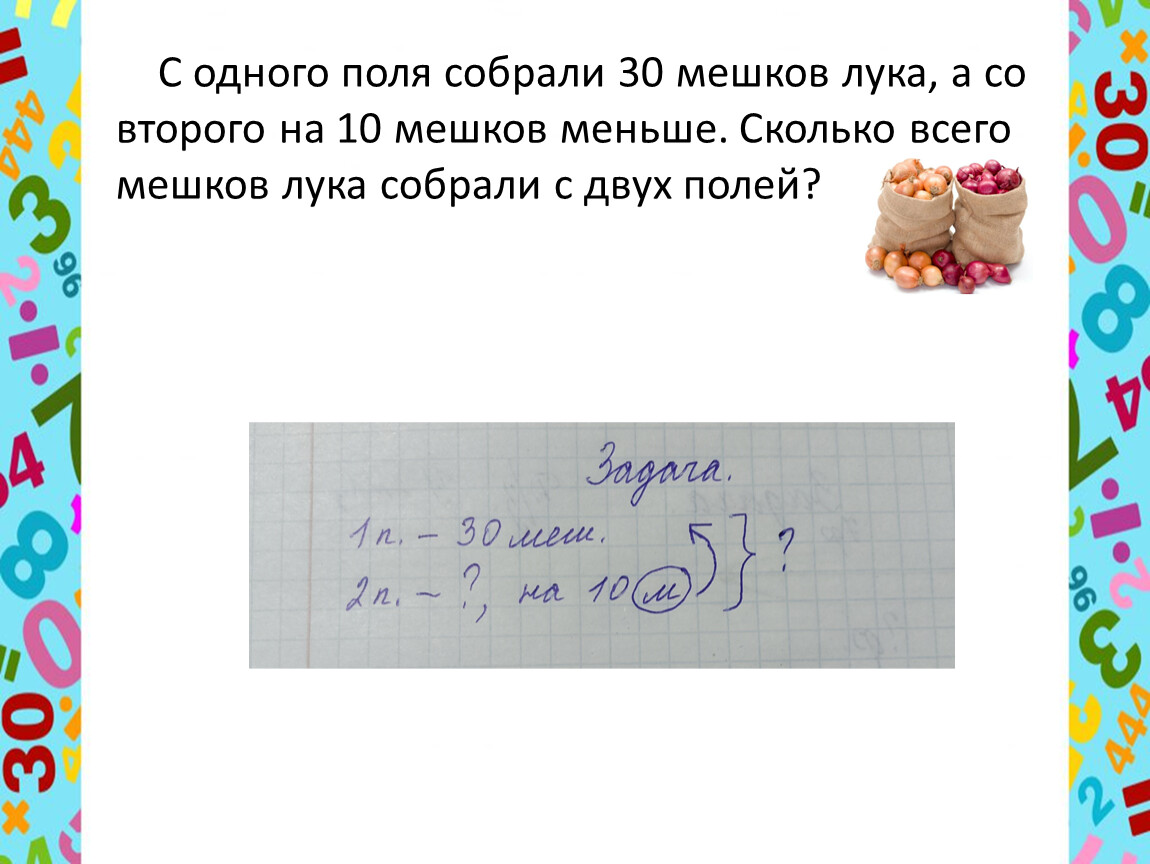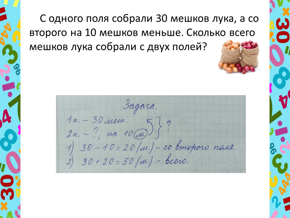 С одного поля собрали 30 мешков лука, а со второго на 10 мешков меньше. Сколько всего мешков лука собрали с двух полей?