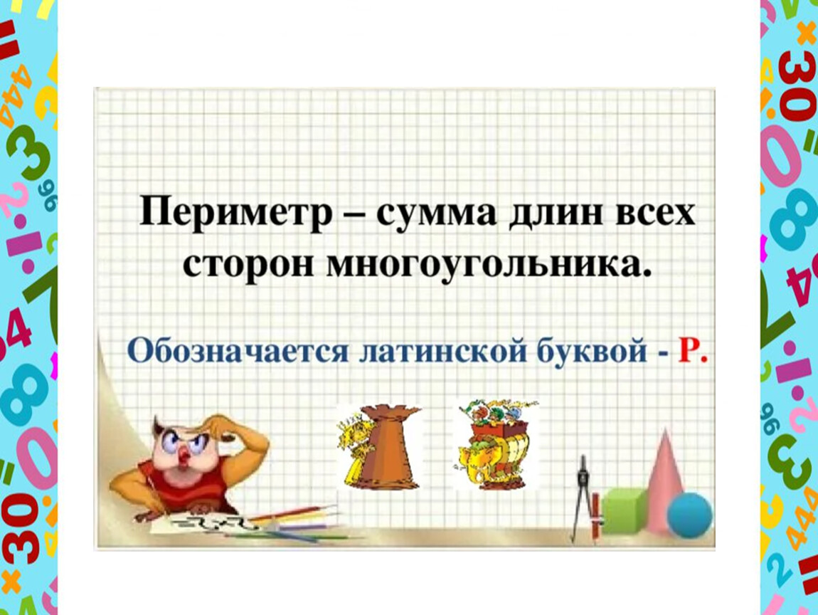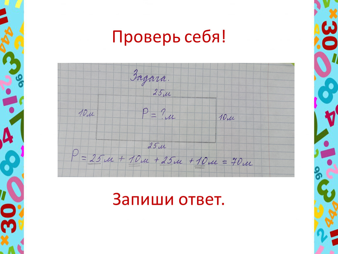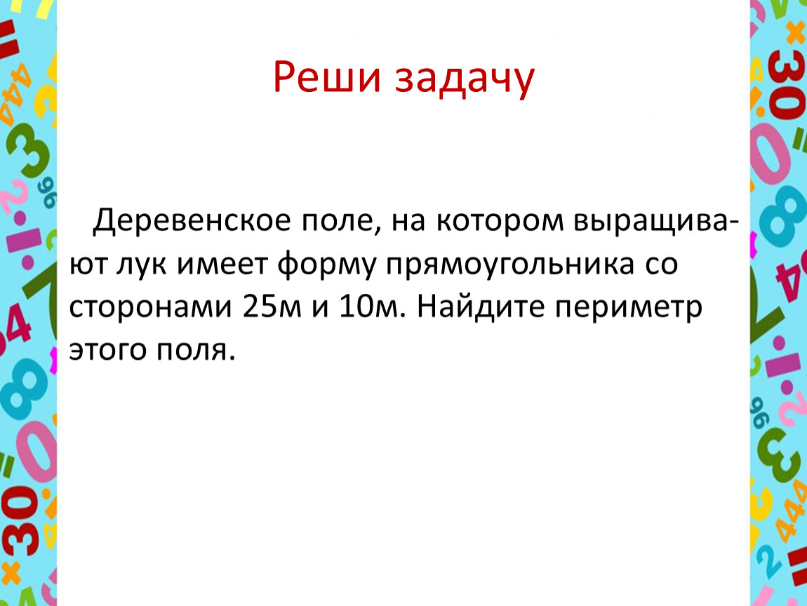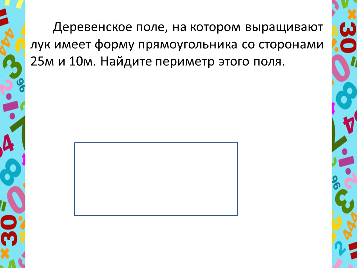 Деревенское поле, на котором выращива-ют лук имеет форму прямоугольника со сторонами 25м и 10м. Найдите периметр этого поля.