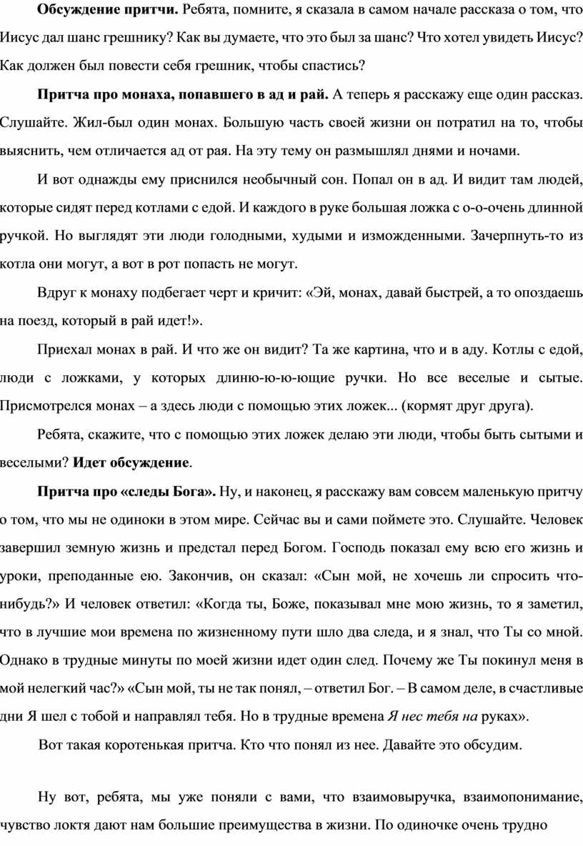 Обсуждение притчи. Ребята, помните, я сказала в самом начале рассказа о том, что Иисус дал шанс грешнику? Как вы думаете, что это был за шанс? Что хотел увидеть Иисус? Как должен был повести себя грешник, чтобы спастись?