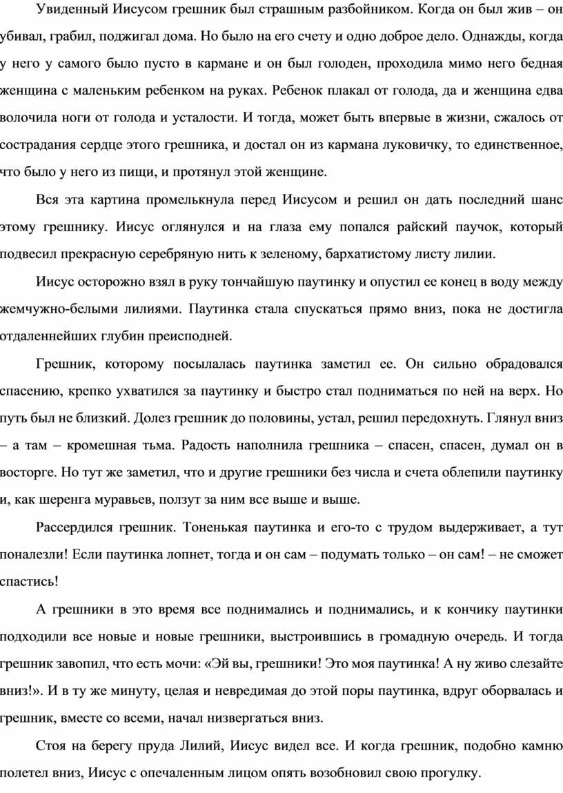 Вся эта картина промелькнула перед Иисусом и решил он дать последний шанс этому грешнику. Иисус оглянулся и на глаза ему попался райский паучок, который подвесил прекрасную серебряную нить к зеленому, бархатистому листу лилии.
