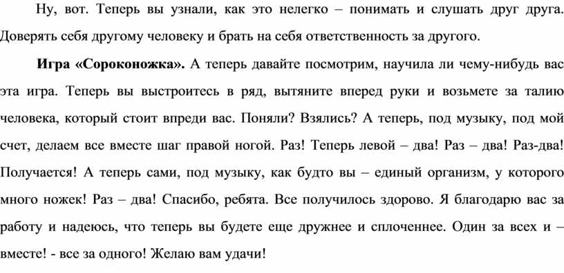 Игра «Сороконожка». А теперь давайте посмотрим, научила ли чему-нибудь вас эта игра. Теперь вы выстроитесь в ряд, вытяните вперед руки и возьмете за талию человека, который стоит впреди вас. Поняли? Взялись? А теперь, под музыку, под мой счет, делаем все вместе шаг правой ногой. Раз! Теперь левой – два! Раз – два! Раз-два! Получается! А теперь сами, под музыку, как будто вы – единый организм, у которого много ножек! Раз – два! Спасибо, ребята. Все получилось здорово. Я благодарю вас за работу и надеюсь, что теперь вы будете еще дружнее и сплоченнее. Один за всех и – вместе! - все за одного! Желаю вам удачи!