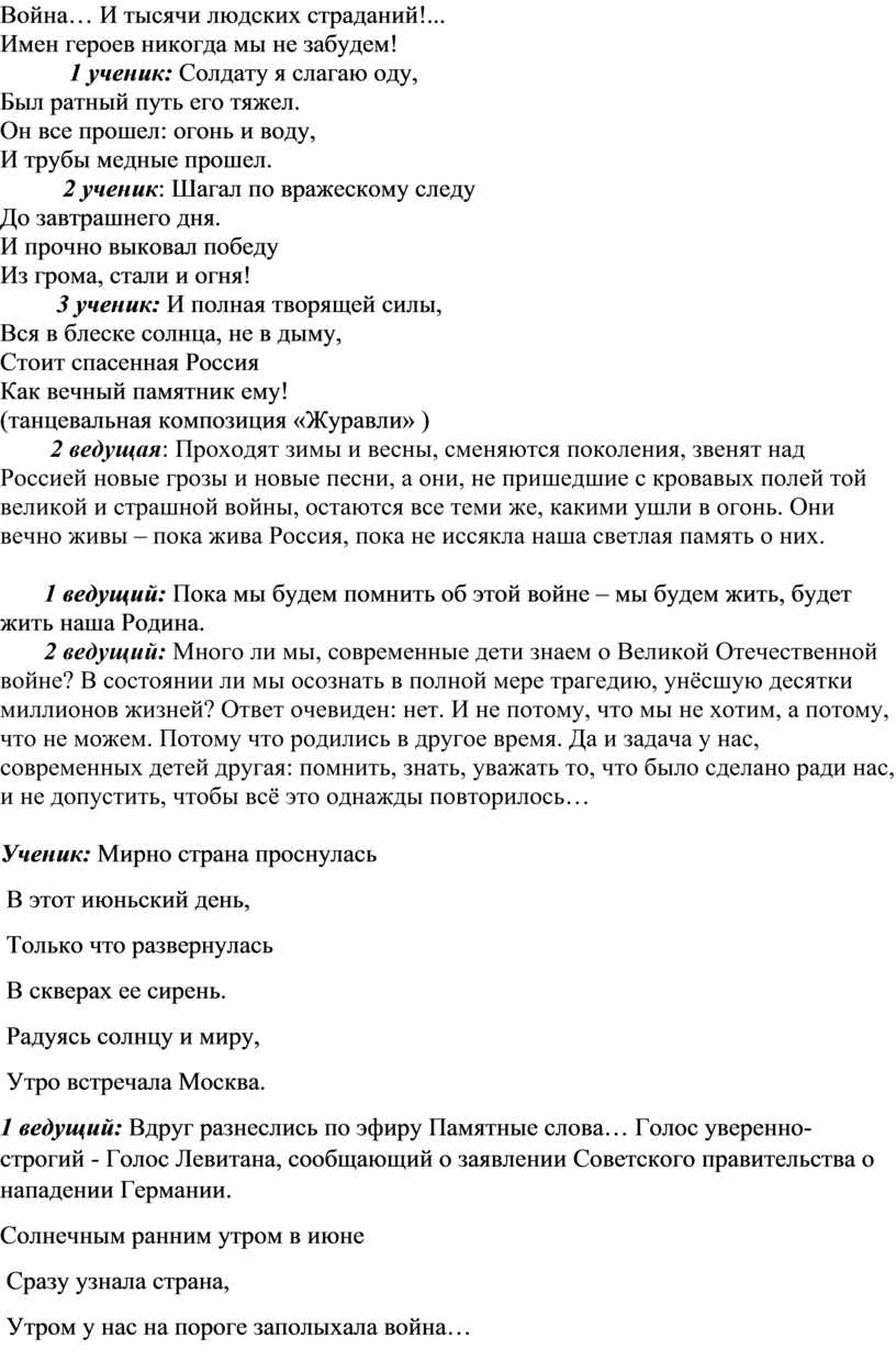 1 ведущий: Пока мы будем помнить об этой войне – мы будем жить, будет жить наша Родина.