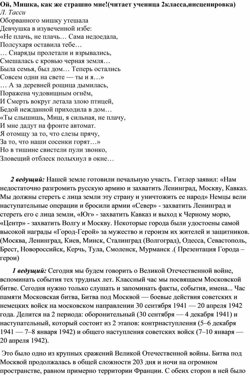 1 ведущий: Сегодня мы будем говорить о Великой Отечественной войне, вспоминать события тех трудных лет. Классный час мы посвящаем Московской битве. Сегодня нужно только слушать и запоминать факты, события, имена... Час памяти Московская битва, Битва под Москвой — боевые действия советских и немецких войск на московском направлении 30 сентября 1941 — 20 апреля 1942 года. Делится на 2 периода: оборонительный (30 сентября — 4 декабря 1941) и наступательный, который состоит из 2 этапов: контрнаступления (5–6 декабря 1941 — 7–8 января 1942) и общего наступления советских войск (7–10 января — 20 апреля 1942).