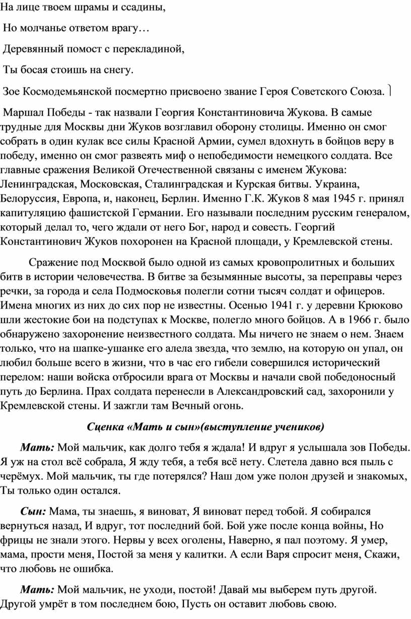 Сражение под Москвой было одной из самых кровопролитных и больших битв в истории человечества. В битве за безымянные высоты, за переправы через речки, за города и села Подмосковья полегли сотни тысяч солдат и офицеров. Имена многих из них до сих пор не известны. Осенью 1941 г. у деревни Крюково шли жестокие бои на подступах к Москве, полегло много бойцов. А в 1966 г. было обнаружено захоронение неизвестного солдата. Мы ничего не знаем о нем. Знаем только, что на шапке-ушанке его алела звезда, что землю, на которую он упал, он любил больше всего в жизни, что в час его гибели совершился исторический перелом: наши войска отбросили врага от Москвы и начали свой победоносный путь до Берлина. Прах солдата перенесли в Александровский сад, захоронили у Кремлевской стены. И зажгли там Вечный огонь.