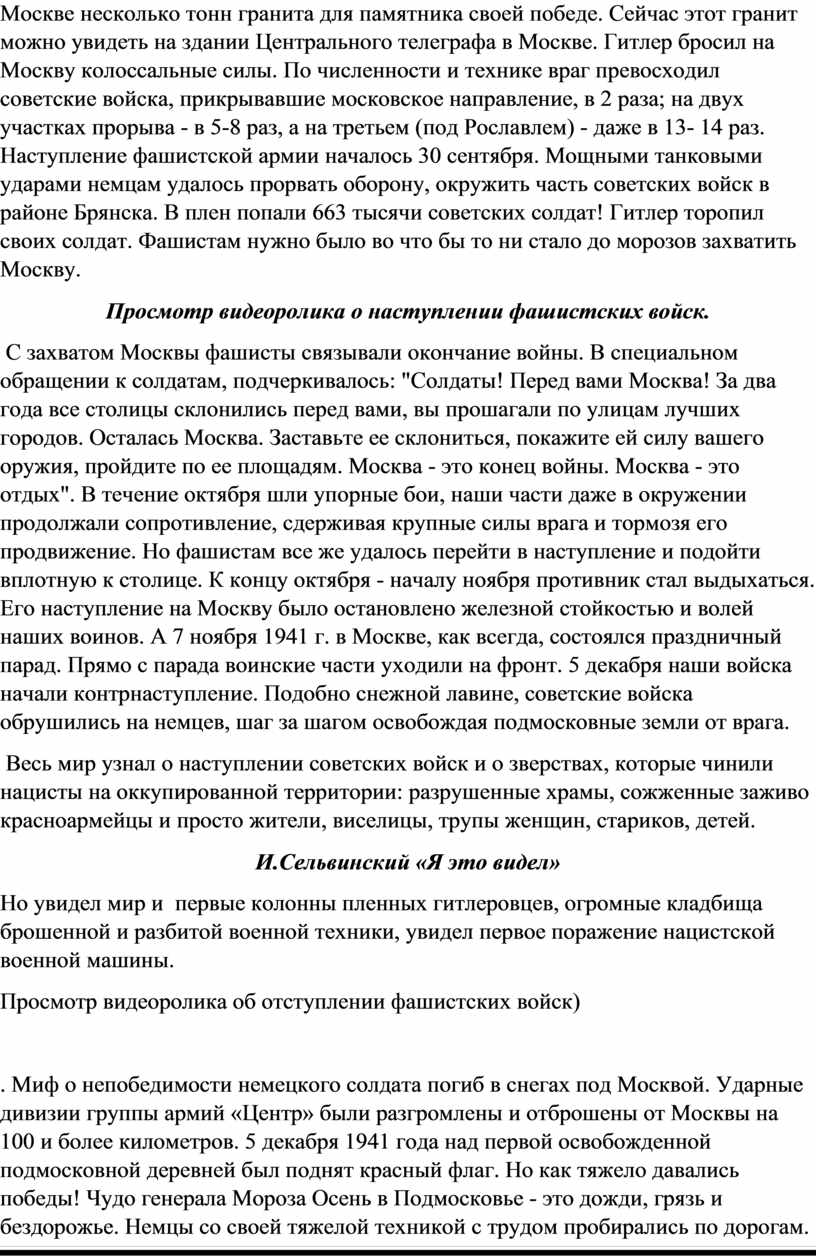 Операция «Тайфун. Вот тогда-то немецко-фашистское командование и составило план взятия Москвы. Этот план фашисты назвали «Тайфун». По этому плану Москва должна быть окружена, захвачена и затоплена. С фашистских самолетов над нашими войсками сбрасывались листовки, в которых говорилось, что в начале ноября Гитлер, подобно Наполеону, въедет в Москву на белом коне, чтобы принять на Красной площади парад своих войск. Гитлеровцы даже подвезли к Москве несколько тонн гранита для памятника своей победе. Сейчас этот гранит можно увидеть на здании Центрального телеграфа в Москве. Гитлер бросил на Москву колоссальные силы. По численности и технике враг превосходил советские войска, прикрывавшие московское направление, в 2 раза; на двух участках прорыва - в 5-8 раз, а на третьем (под Рославлем) - даже в 13- 14 раз. Наступление фашистской армии началось 30 сентября. Мощными танковыми ударами немцам удалось прорвать оборону, окружить часть советских войск в районе Брянска. В плен попали 663 тысячи советских солдат! Гитлер торопил своих солдат. Фашистам нужно было во что бы то ни стало до морозов захватить Москву.