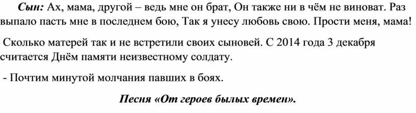 Сын: Ах, мама, другой – ведь мне он брат, Он также ни в чём не виноват. Раз выпало пасть мне в последнем бою, Так я унесу любовь свою. Прости меня, мама!