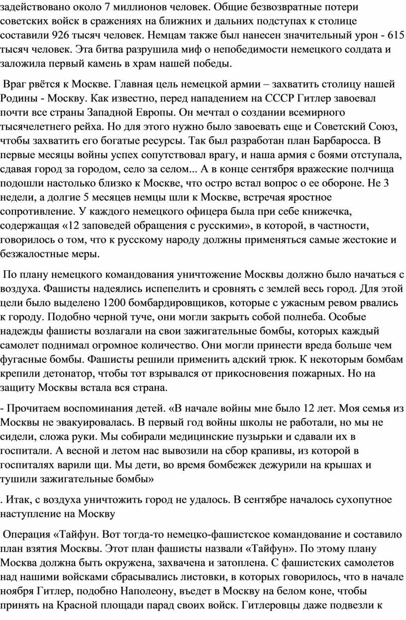 Враг рвётся к Москве. Главная цель немецкой армии – захватить столицу нашей Родины - Москву. Как известно, перед нападением на СССР Гитлер завоевал почти все страны Западной Европы. Он мечтал о создании всемирного тысячелетнего рейха. Но для этого нужно было завоевать еще и Советский Союз, чтобы захватить его богатые ресурсы. Так был разработан план Барбаросса. В первые месяцы войны успех сопутствовал врагу, и наша армия с боями отступала, сдавая город за городом, село за селом... А в конце сентября вражеские полчища подошли настолько близко к Москве, что остро встал вопрос о ее обороне. Не 3 недели, а долгие 5 месяцев немцы шли к Москве, встречая яростное сопротивление. У каждого немецкого офицера была при себе книжечка, содержащая «12 заповедей обращения с русскими», в которой, в частности, говорилось о том, что к русскому народу должны применяться самые жестокие и безжалостные меры.
