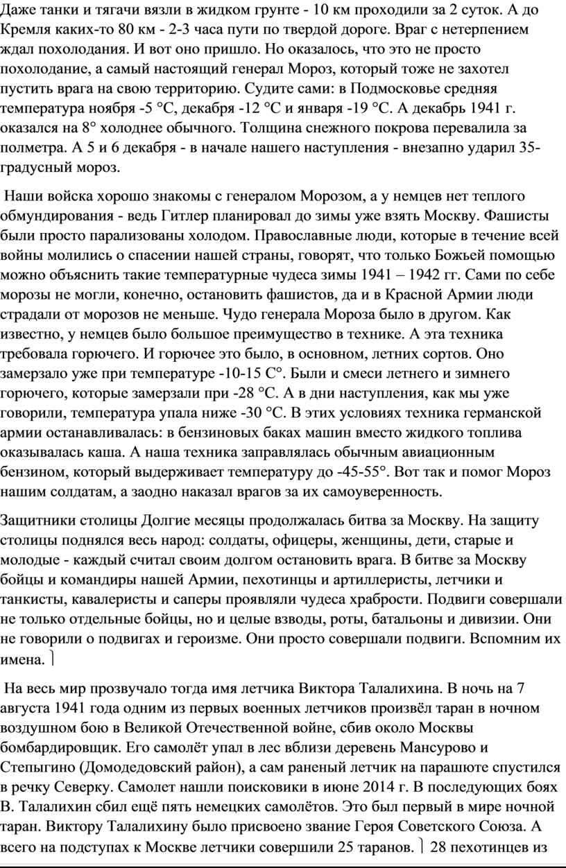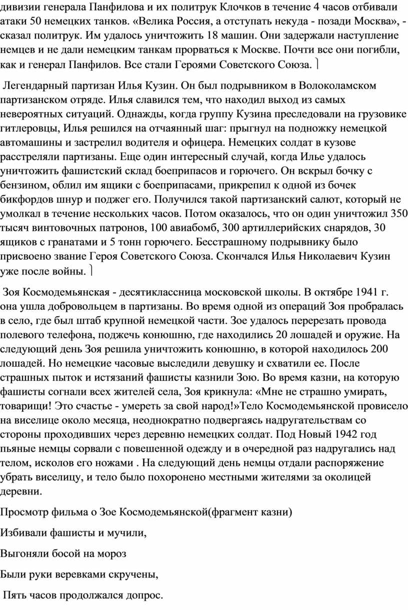 На весь мир прозвучало тогда имя летчика Виктора Талалихина. В ночь на 7 августа 1941 года одним из первых военных летчиков произвёл таран в ночном воздушном бою в Великой Отечественной войне, сбив около Москвы бомбардировщик. Его самолёт упал в лес вблизи деревень Мансурово и Степыгино (Домодедовский район), а сам раненый летчик на парашюте спустился в речку Северку. Самолет нашли поисковики в июне 2014 г. В последующих боях В. Талалихин сбил ещё пять немецких самолётов. Это был первый в мире ночной таран. Виктору Талалихину было присвоено звание Героя Советского Союза. А всего на подступах к Москве летчики совершили 25 таранов. ü 28 пехотинцев из дивизии генерала Панфилова и их политрук Клочков в течение 4 часов отбивали атаки 50 немецких танков. «Велика Россия, а отступать некуда - позади Москва», - сказал политрук. Им удалось уничтожить 18 машин. Они задержали наступление немцев и не дали немецким танкам прорваться к Москве. Почти все они погибли, как и генерал Панфилов. Все стали Героями Советского Союза. ü