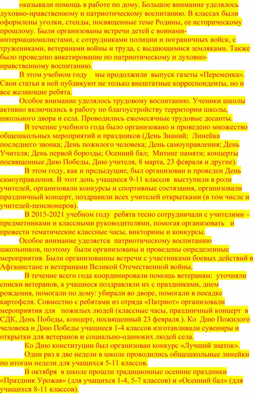 В течение всего года была объявлена акция «Оглянись вокруг», в рамках которой была организована работа по оказанию шефской помощи пожилым и одиноким людям села, ветеранам ВОВ, для них ребята готовили подарки, дарили цветы, готовили концертную программу, угощали чаем, оказывали помощь в работе по дому. Большое внимание уделялось духовно-нравственному и патриотическому воспитанию. В классах были оформлены уголки, стенды, посвященные теме Родины, ее историческому прошлому. Были организованы встречи детей с воинами-интернационалистами, с сотрудниками полиции и пограничных войск, с тружениками, ветеранами войны и труда, с выдающимися земляками. Также было проведено анкетирование по патриотическому и духовно-нравственному воспитанию.