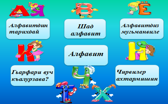 ( ГъвечIи рушавай вири гьарфар какахьнава. Адаз куьмек герек къвезва. Аялриз гьарфар алай карточкаяр пайда, абуру галай-галайвал гьарфарин тIварар лугьуда, алфавитдин къайда хвена.)