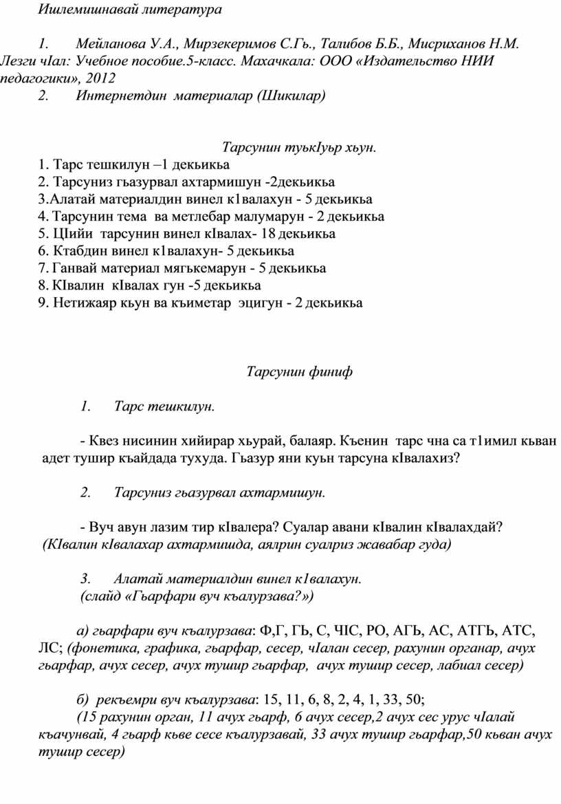 1. Мейланова У.А., Мирзекеримов С.Гь., Талибов Б.Б., Мисриханов Н.М. Лезги чIал: Учебное пособие.5-класс. Махачкала: ООО «Издательство НИИ педагогики», 2012