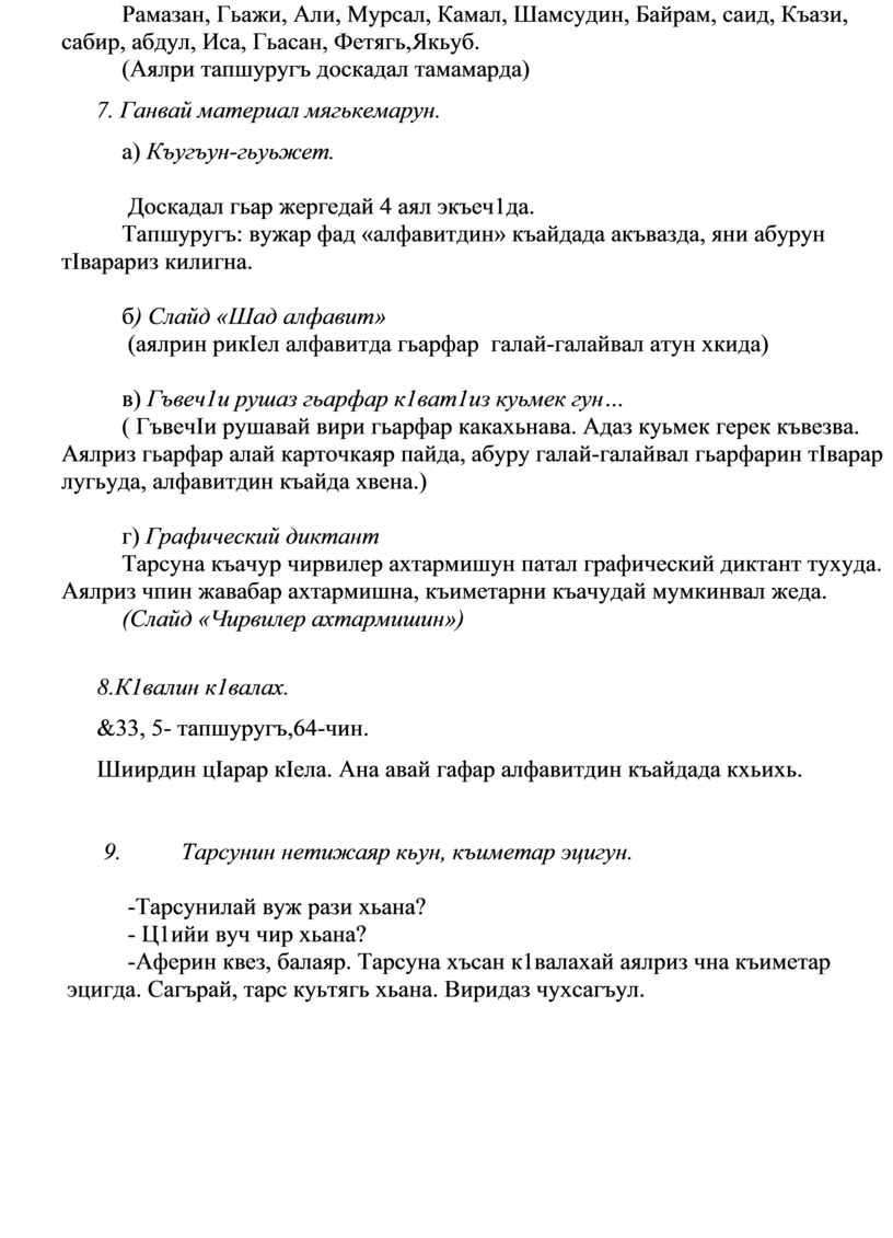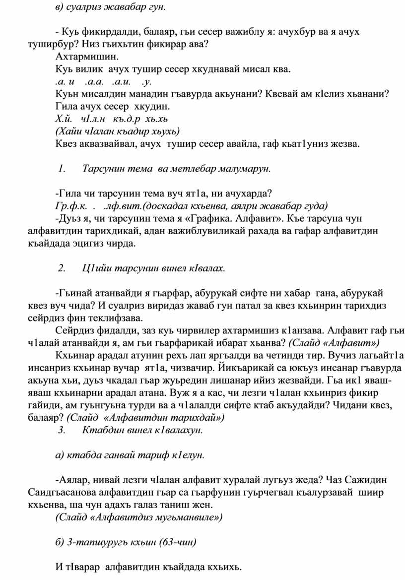-Дуьз я, чи тарсунин тема я «Графика. Алфавит». Къе тарсуна чун алфавитдин тарихдикай, адан важиблувиликай рахада ва гафар алфавитдин къайдада эцигиз чирда.