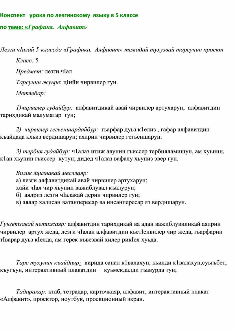 Лезги чIалай 5-классда «Графика. Алфавит» темадай тухузвай тарсунин проект