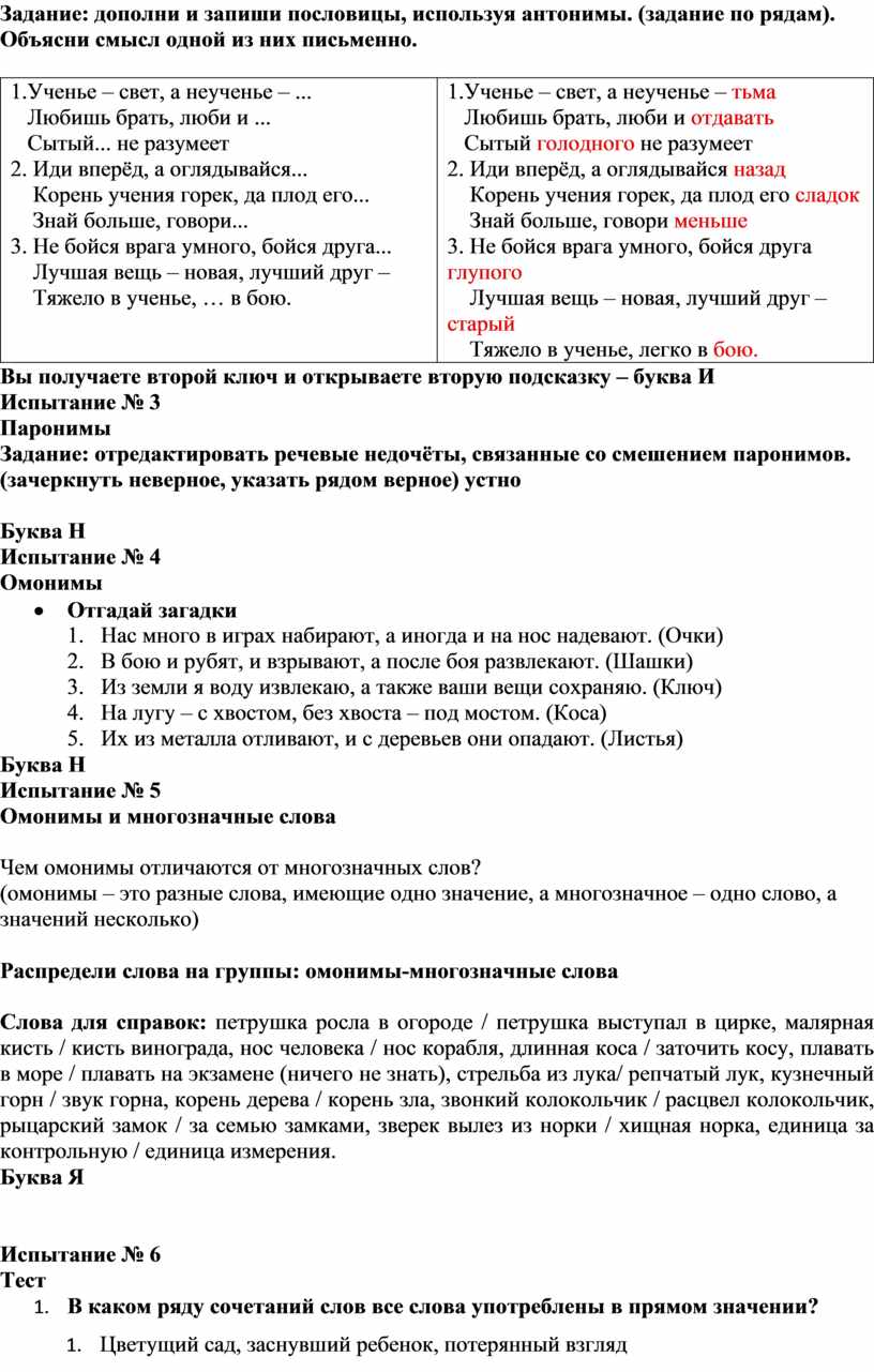 Слова для справок: петрушка росла в огороде / петрушка выступал в цирке, малярная кисть / кисть винограда, нос человека / нос корабля, длинная коса / заточить косу, плавать в море / плавать на экзамене (ничего не знать), стрельба из лука/ репчатый лук, кузнечный горн / звук горна, корень дерева / корень зла, звонкий колокольчик / расцвел колокольчик, рыцарский замок / за семью замками, зверек вылез из норки / хищная норка, единица за контрольную / единица измерения.