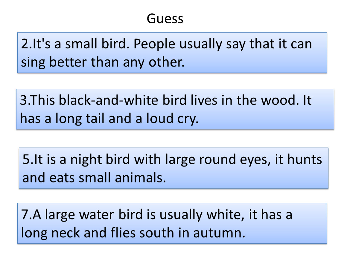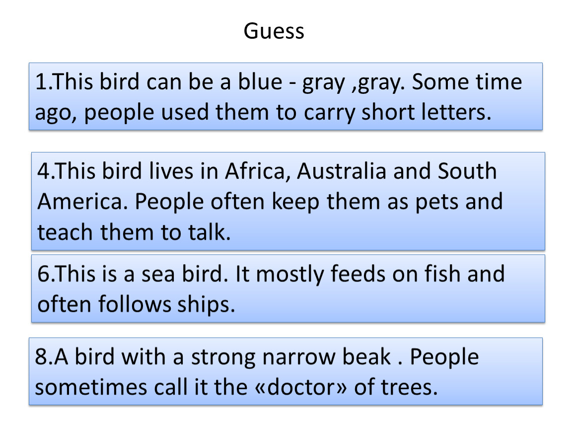 8.А bird with a strong narrow beak . People sometimes call it the «doctor» of trees.