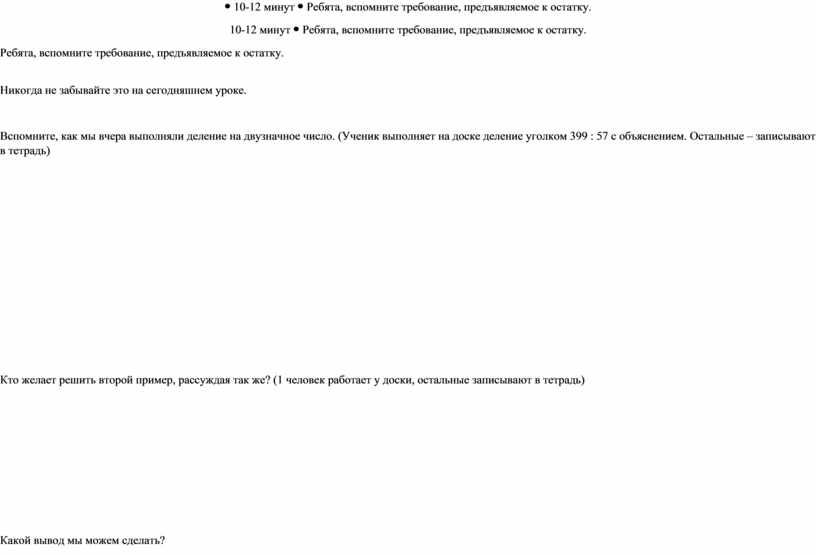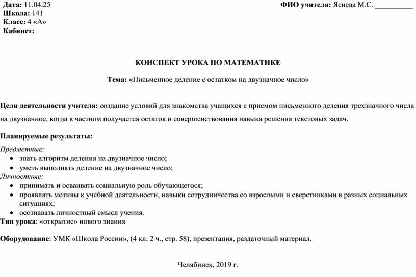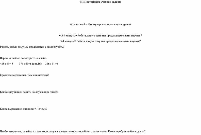 Цели деятельности учителя: создание условий для знакомства учащихся с приемом письменного деления трехзначного числа на двузначное, когда в частном получается остаток и совершенствования навыка решения текстовых задач.