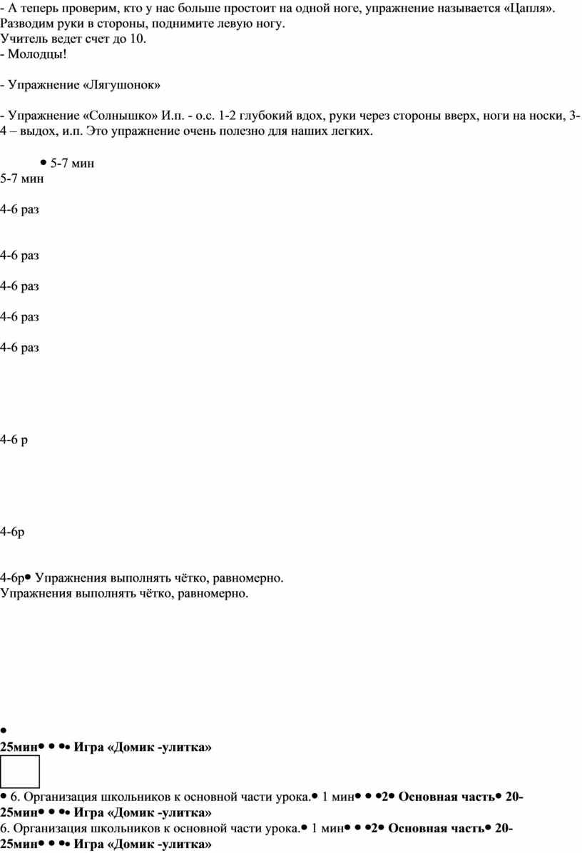 - А теперь проверим, кто у нас больше простоит на одной ноге, упражнение называется «Цапля». Разводим руки в стороны, поднимите левую ногу. Учитель ведет счет до 10. - Молодцы!