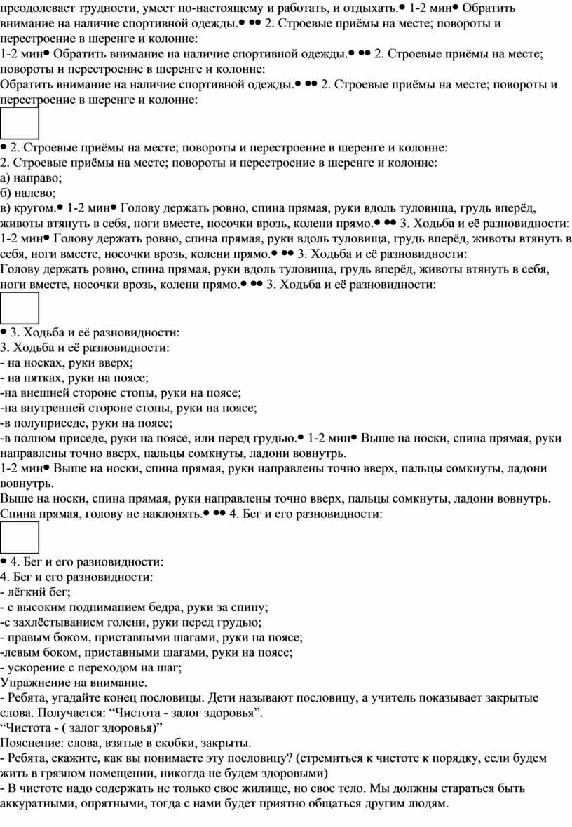 4. Бег и его разновидности: - лёгкий бег; - с высоким подниманием бедра, руки за спину; -с захлёстыванием голени, руки перед грудью; - правым боком, приставными шагами, руки на поясе; -левым боком, приставными шагами, руки на поясе; - ускорение с переходом на шаг; Упражнение на внимание. - Ребята, угадайте конец пословицы. Дети называют пословицу, а учитель показывает закрытые слова. Получается: “Чистота - залог здоровья”. “Чистота - ( залог здоровья)” Пояснение: слова, взятые в скобки, закрыты. - Ребята, скажите, как вы понимаете эту пословицу? (стремиться к чистоте к порядку, если будем жить в грязном помещении, никогда не будем здоровыми) - В чистоте надо содержать не только свое жилище, но свое тело. Мы должны стараться быть аккуратными, опрятными, тогда с нами будет приятно общаться другим людям.