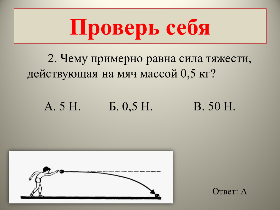 2. Чему примерно равна сила тяжести, действующая на мяч массой 0,5 кг?