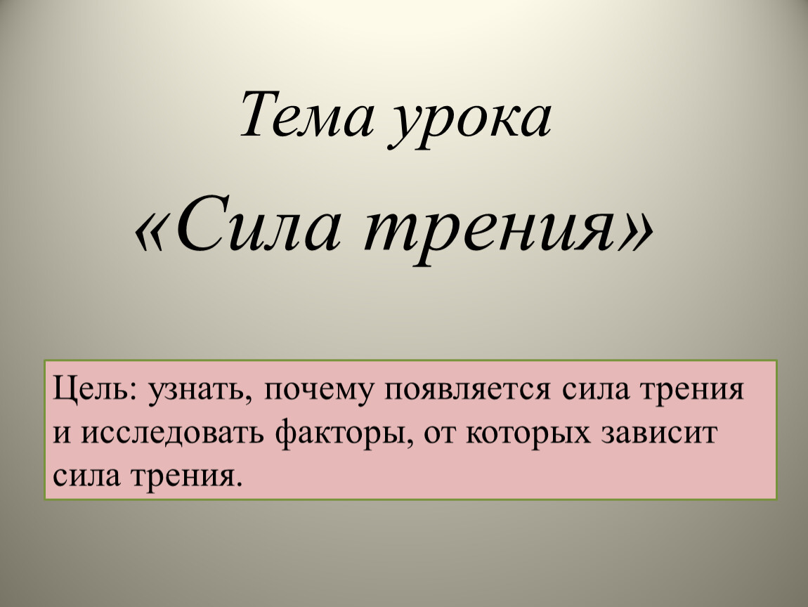 Цель: узнать, почему появляется сила трения и исследовать факторы, от которых зависит сила трения.