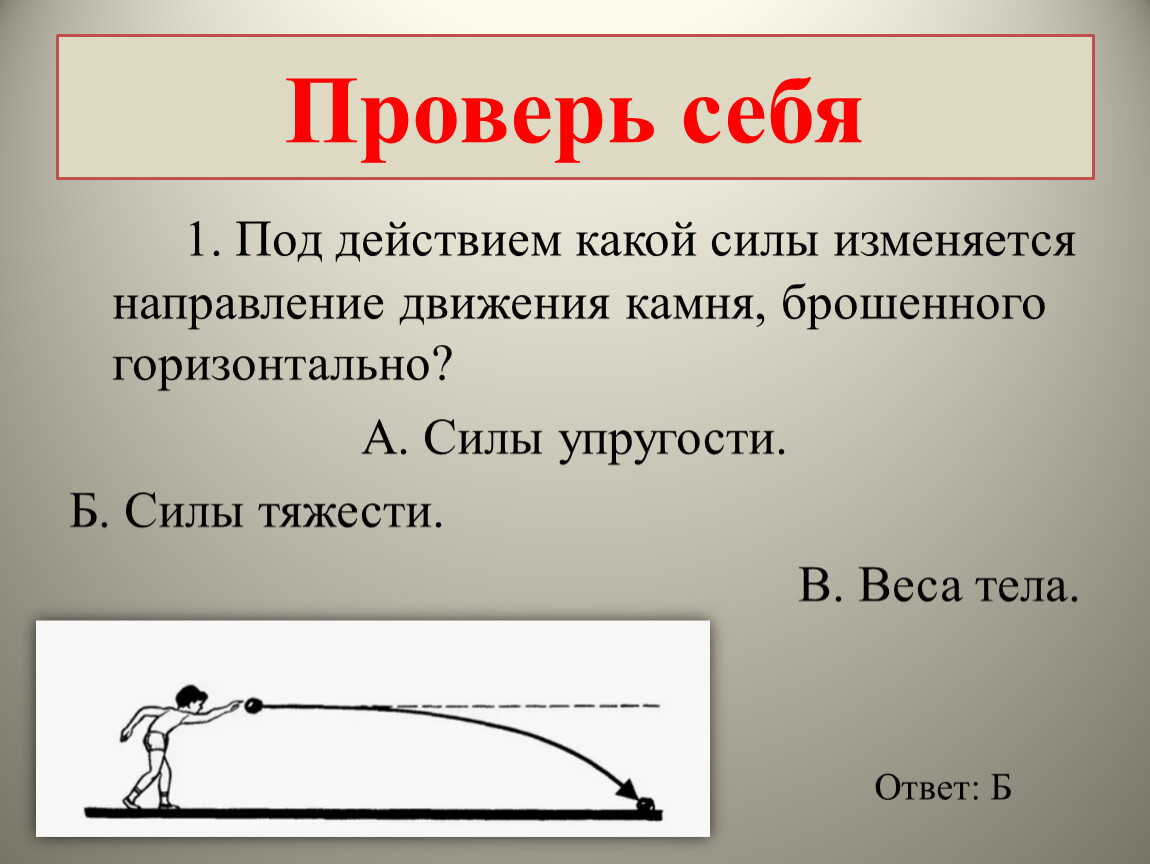 1. Под действием какой силы изменяется направление движения камня, брошенного горизонтально?