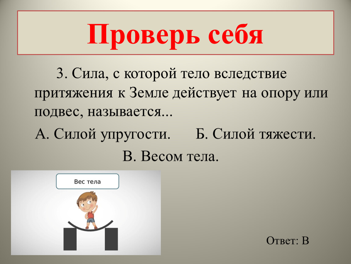 3. Сила, с которой тело вследствие притяжения к Земле действует на опору или подвес, называется...