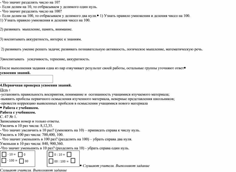 Технологическая карта урока «Умножение и деление на 10 и 100»