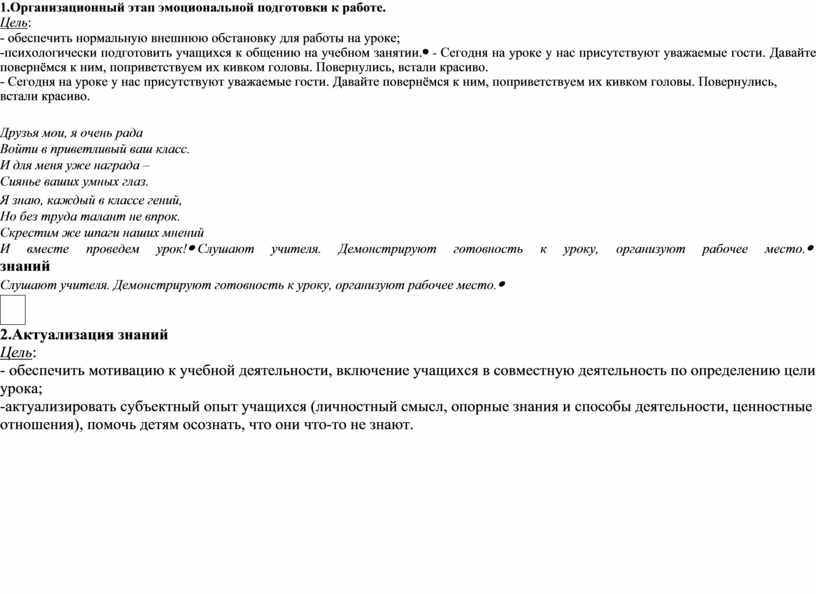 1.Организационный этап эмоциональной подготовки к работе. Цель: - обеспечить нормальную внешнюю обстановку для работы на уроке; -психологически подготовить учащихся к общению на учебном занятии. |