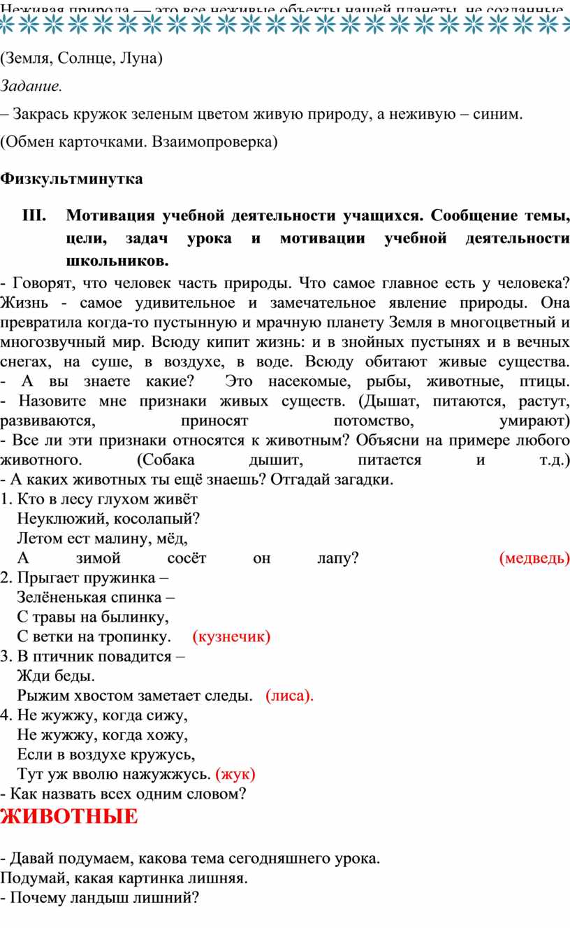 - Говорят, что человек часть природы. Что самое главное есть у человека? Жизнь - самое удивительное и замечательное явление природы. Она превратила когда-то пустынную и мрачную планету Земля в многоцветный и многозвучный мир. Всюду кипит жизнь: и в знойных пустынях и в вечных снегах, на суше, в воздухе, в воде. Всюду обитают живые существа. - А вы знаете какие? Это насекомые, рыбы, животные, птицы. - Назовите мне признаки живых существ. (Дышат, питаются, растут, развиваются, приносят потомство, умирают) - Все ли эти признаки относятся к животным? Объясни на примере любого животного. (Собака дышит, питается и т.д.) - А каких животных ты ещё знаешь? Отгадай загадки.