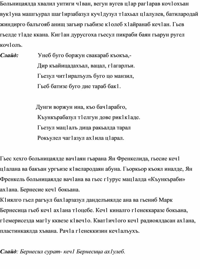 Френкельги, Марк Бернесги , авар мац1алда кеч1алъе бакъан