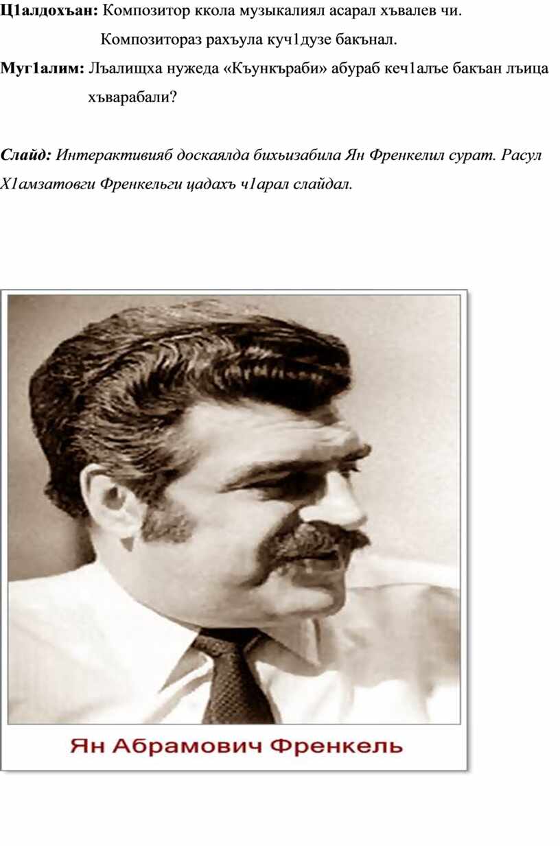 Слайд: Интерактивияб доскаялда бихьизабила Ян Френкелил сурат. Расул Х1амзатовги Френкельги цадахъ ч1арал слайдал.