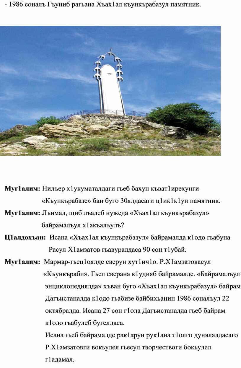 - 1986 соналъ Гъуниб рагьана Хъах1ал къункърабазул памятник.