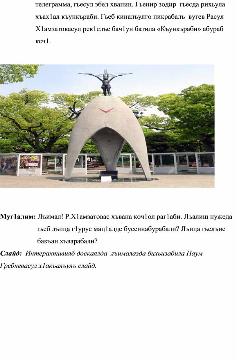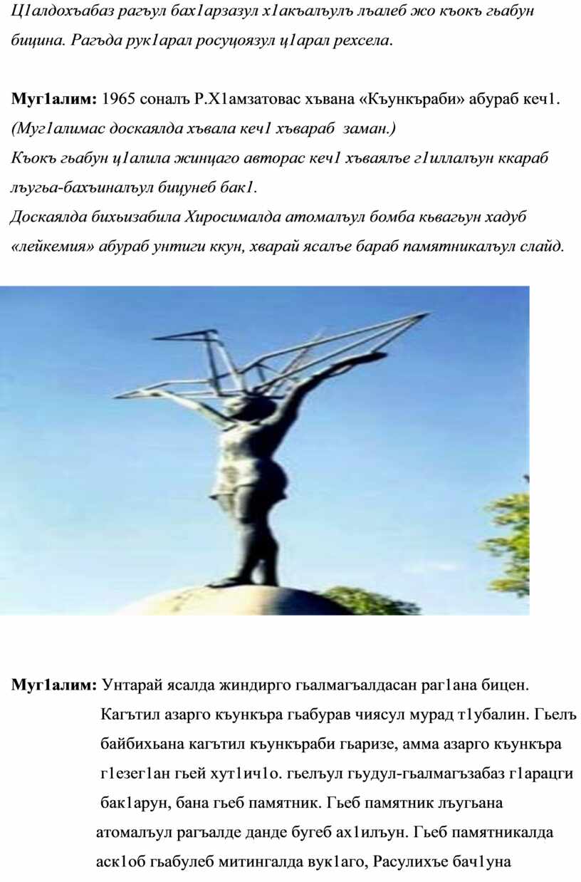 Доскаялда бихьизабила Хиросималда атомалъул бомба кьвагьун хадуб «лейкемия» абураб унтиги ккун, хварай ясалъе бараб памятникалъул слайд.